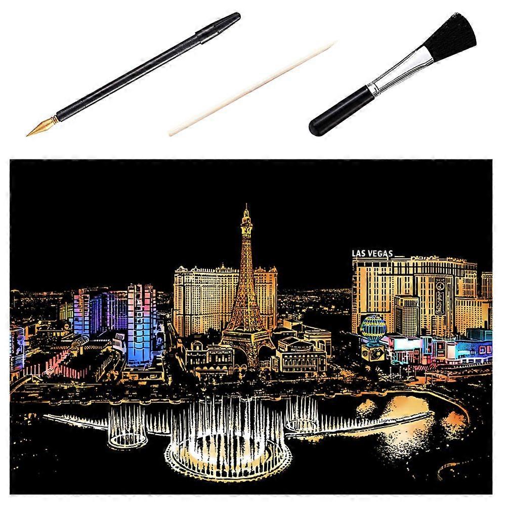 1 Set of 4pcs DIY Scratch Picture Las Vegas Nocturne Scratching Drawing Painting Paper Scratchboard with Bamboo Stick Gold-plated Pen Brush