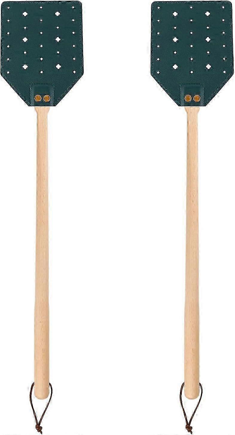 2 Pack Leather Fly Swatters with Wooden Handle and Lanyard (Dark Green)