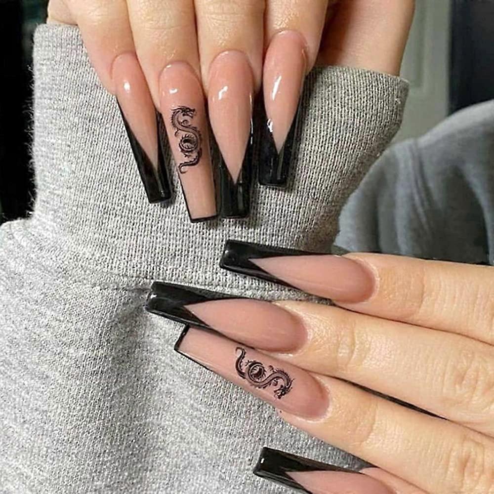 24 Pcs Press on Nails Long Fake Nails Acrylic Nails Ballet French Black Nails with Dragon Design Nails with Nails for Women and Girls,2024 Ping