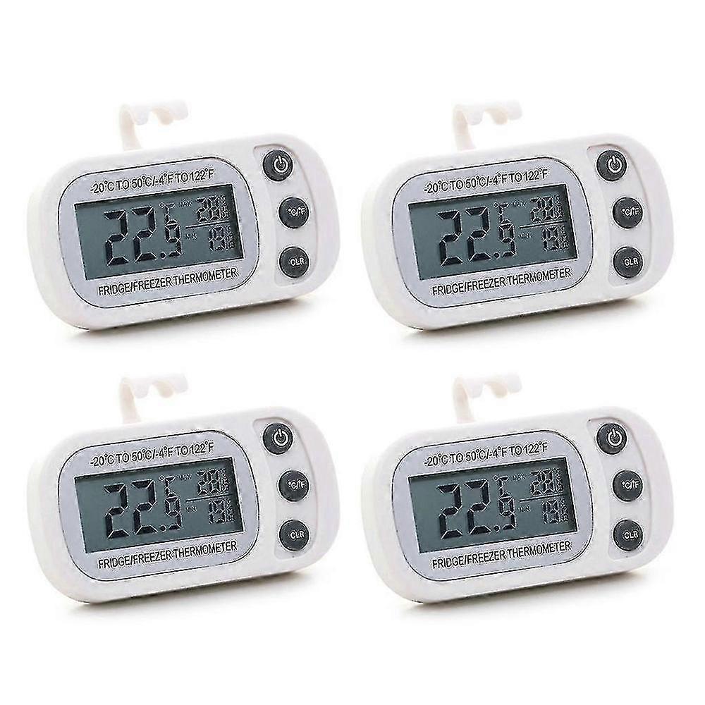 Keep precise track of your appliance temperatures with this 4-pack of digital thermometers. Each unit features a large, easy-to-read LCD screen that clearly displays the current temperature, as well as the maximum and minimum recorded values since the last reset. Ideal for monitoring refrigerators, freezers, wine coolers, or rooms. **Key Features:** * **Accurate Monitoring:** Measures a wide range from -20°C to 50°C (-4°F to 122°F) with an accuracy of ±1°C (±2°F). * **Max/Min Memory:** Records and displays the highest and lowest temperatures reached, helping you identify fluctuations. * **Clear Display:** Large LCD screen with a resolution of 0.1°C (0.2°F) for precise readings. * **Versatile Placement:** Includes both a built-in stand for shelves and a hook for hanging, offering flexible installation. * **Ready to Use:** Comes with the required battery installed and operates efficiently. **Specifications:** * Material: Durable ABS plastic * Available Colors: White or Black * Product Dimensions (each): Approx. 88 x 60 x 24 mm * Contents: 4 x Digital Thermometer