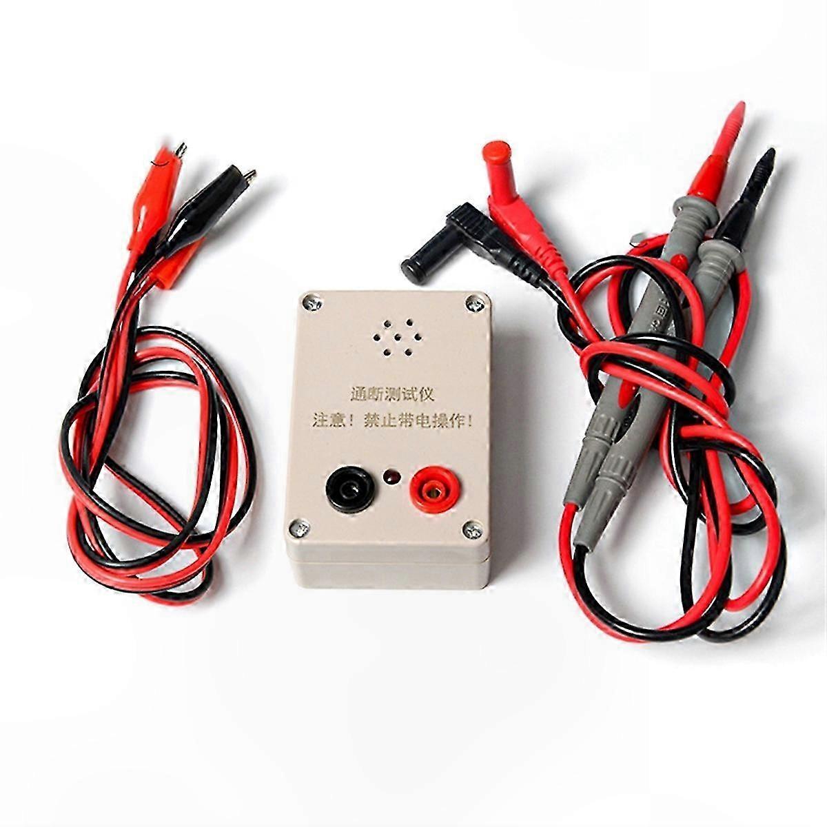1. The product features an ble buzzer alarm (approximately 100 dB) and a visual indicator light. 2. Usage: After inserting the test leads, touch the two ends of the wire being tested. An ble and visual alarm indicates continuity; no alarm indicates an open circuit. 3. The device contains a built-in 9V battery. The battery compartment cover can be opened for battery replacement. When the red and black test leads are not connected to a circuit, no current flows and there is no power consumption. 4. When the test circuit is closed, the loop current is approximately 20 mA. This tester is not intended for use with sensitive electronic components or printed circuit boards. Part Name: 9V Continuity Tester Note: Suitable for testing cables, wires, PCB traces, and general continuity verification. Precautions: Do not use while the device or circuit under test is powered. Color: As shown Material: Plastic Package Contents: 1 x Continuity Tester 1 x Multimeter Test Lead 1 x Red and Black Alligator Clip Lead Note: Color may vary slightly due to lighting and screen settings. Measurement tolerance: ±1–3 cm.