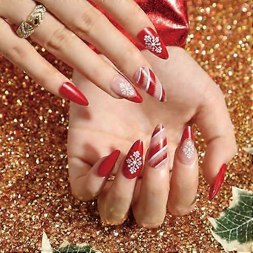 BRTNUP 24Pcs Christmas False Nails, Christmas Press on Nails, Almond Press on Nails, Red White Fake Nails with Snowflake, Xmas Full Cover Acrylic Fals