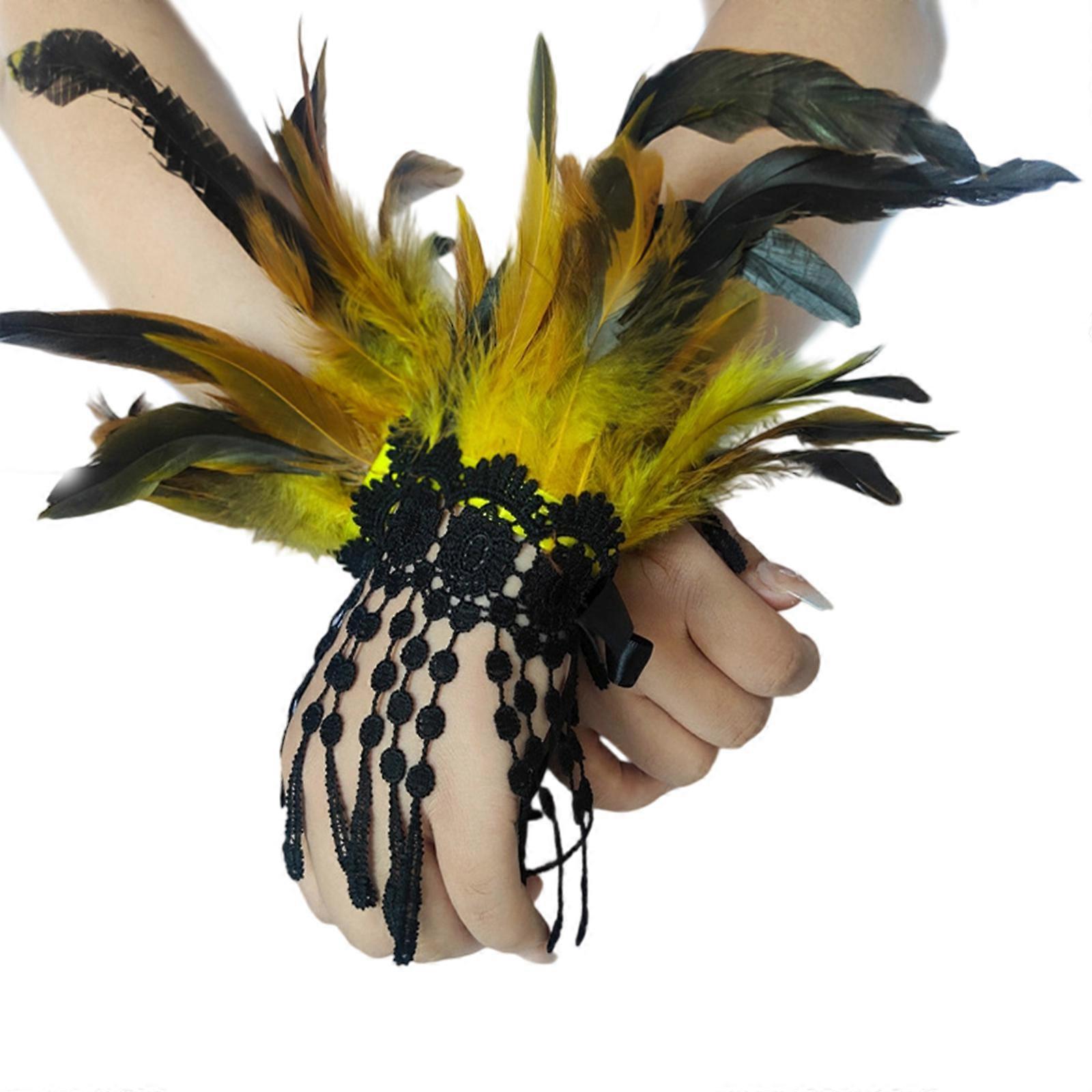 Adjustable Lace Arm Warmers With Feather Fringe For Women’s Halloween Gothic Costume Accessories Yellow