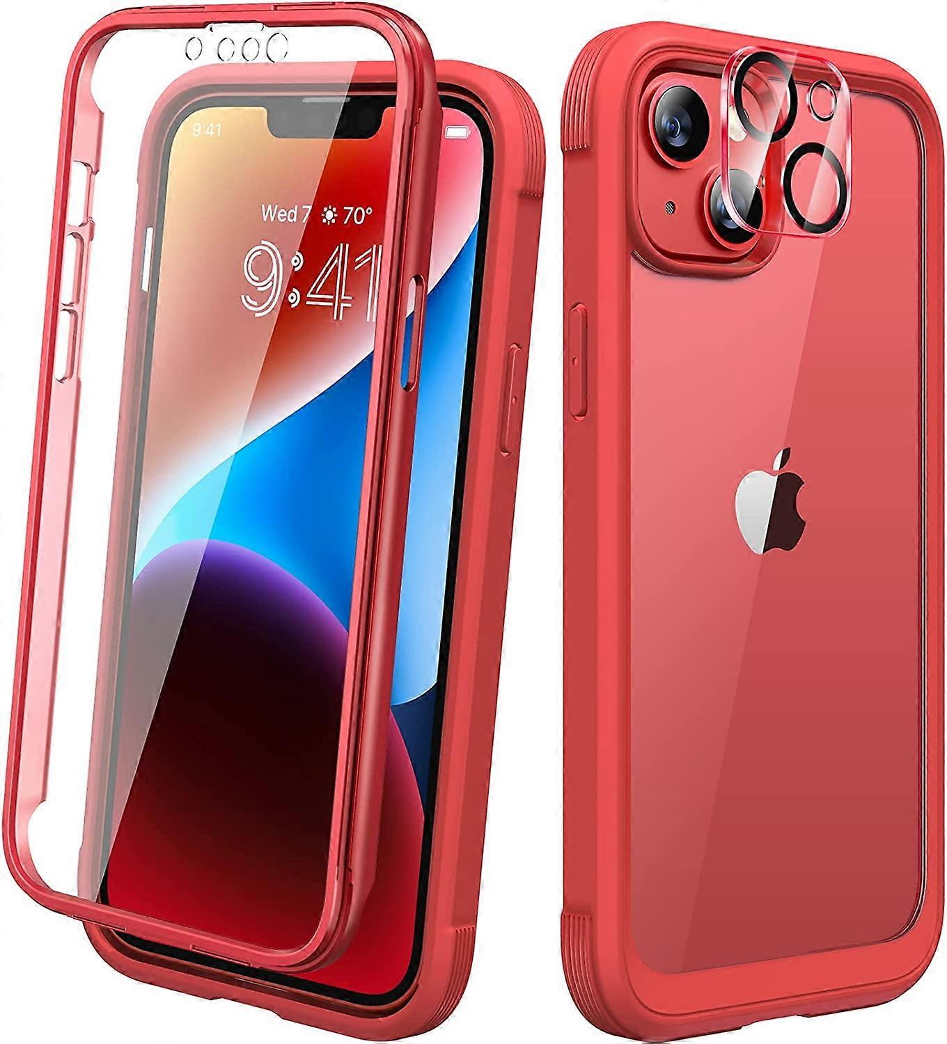 Diaclara Rugged Case compatible with iPhone 14, Full Body Protection with Built-in Screen & Camera Lens Protector, Red and Clear, 6.1"