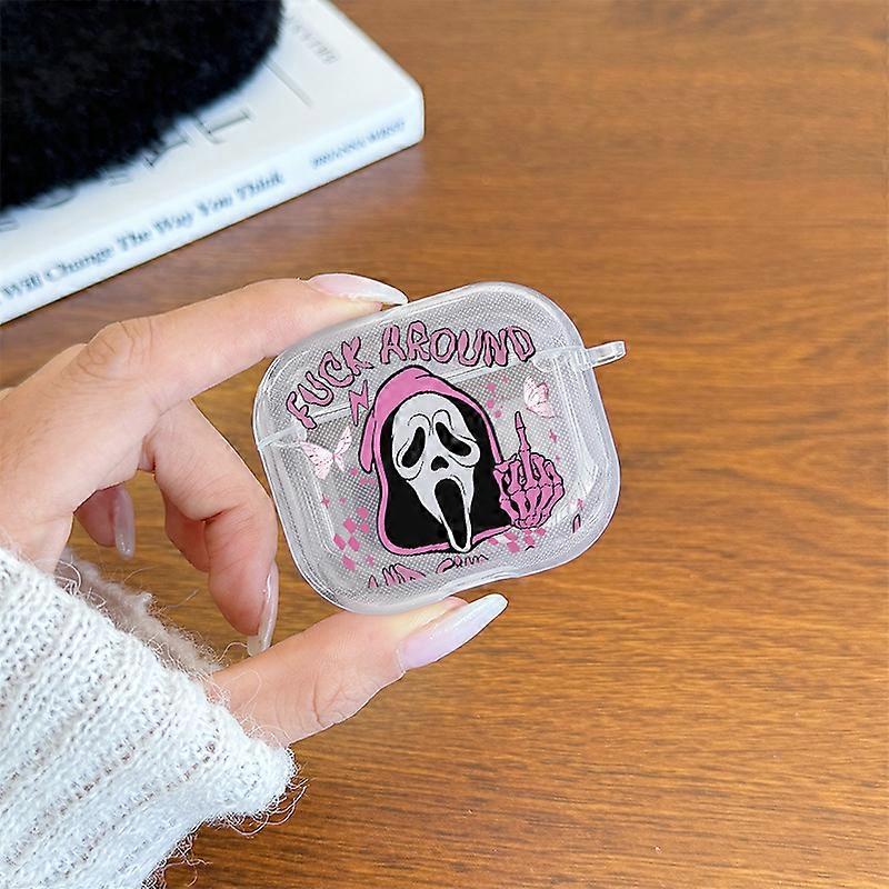Gothic Ghost Face Print Case For AirPods 4/3/2/1 Earphone Case with Carabiner, Airpod Pro2/Pro3 Pink Skeleton Protective Cover