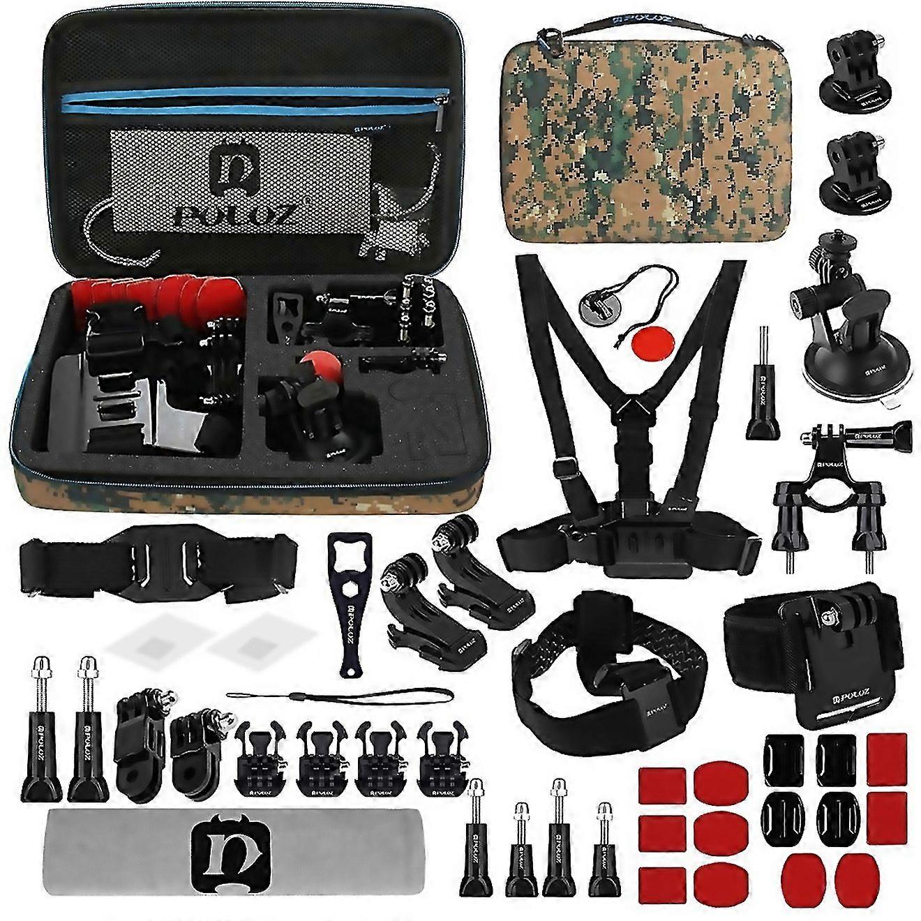 Fangrui Product Details 1. Puluz 45 In 1 Accessories Ultimate Combo Kits With Camouflage Eva Case (chest Strap + Suction Cup Mount + 3-way Pivot Arms + J-hook Buckle + Wrist Strap + Helmet Strap + Surface Mounts + Tripod Adapter + Storage Bag + Handlebar Mount + Wrench) For Gopro, Insta360, Dji And Other Action Cameras 2. Features 3. Suitable For Gopro Cameras (camera Is Not Included). 4. Adjustable And Compact Design Chest Belt Strap Mount And Head Strap Mount, Made Of Superior Plastic And Nylon. 5. Suitable For Ideal Requires A Great Deal Of Support Activities. 6. Screws For Fixing Cameras To A Bobber Hand Grip Or J-hook Buckle. 7. The Adhesive Mount Is For Attaching The Camera To A Curved Surface Like A Snowboarding, Skydiving Or Skateboarding Helmet. 8. Safety Tethers Strap Should Be Attached Securely To Prevent Dv Throw Out When You Are Surfing. 9. Portable Box Is Good Shaped Compartments For A Camera, Outer Housing, And Accessories. 10. Kit Accessories 11. Large Size 32cm X 22cm X 7cm Camouflage Eva Case 12. Handlebar Mount With Screw 13. Suction Cup Mount With Adapter & Screw 14. Chest Strap 15. Wrist Strap Mount 16. 3-way Pivot Arms With Screws 17. J-hook Buckles * 2pcs 18. Surfing Quick Release Buckles * 4pcs 19. Helmet Strap 20. Curved Surface Mounts * 2pcs + Flat Surface Mounts * 2pcs + Adhesive Mount Stickers * 4pcs 21. Adhesive Mount Stickers * 6pcs 22. Safety Tethers Strap With Self Adhesive Sticker 23. Storage Bag 24. Tripod Adapter 25. Plastic Wrench With Lanyard 26. Head Strap 27. Long Screw * 2pcs + Short Screw * 2pcs 28. Anti-fog Inserts * 2pcs