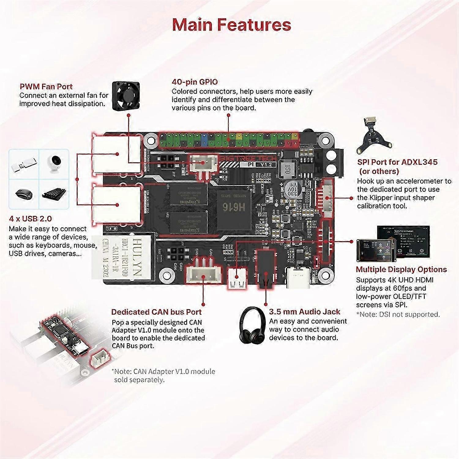 SKR Mini E3 V3.0 32 bit control board adoptes the G0 series MCU-STM32G0B1RET6 or STM32G0B0RET6 ARM Coretex. integrated TMC2209 Silent stepper motor drive. Support runing Klipper&. SKR MINI E3 V3.0 control board integrated ultra silent TMC2209 uart stepper driver, designed for 3, plug and playing. Compatible with for 5/for 5 Pro/for 3 V2 3D Printer, the firmware is pre-install well before we ship out, you can select the firmware base on your needs. Pi V1.2 board adopts ALLWINNER H616, 64-bit Quad-core, -A53 1.5GHz Processor, RAM is 1GB DDR3L SDRAM. Size is 85x56mm, the same as the for Raspberry-Pi 3B/4B. Making it a seamless fit for your existing projects. Pi V1.2 core board display adopts MaliG32 MP2 GPU, support for OpenGL3.2 and HDMI2.0A UHD 4K Video & Audio output and SPI screen( HDMI5/7, TFT35 SPI), onboard 4xUSB2.0 port. Powerful high performance details and clarity. Rich Connectivity: Onboard standard 40-pinGPIO header, 3.5mm audio jack, TF card slot, adxl345 spi, USB to CAN module(requires CAN adapter V1.0 module). Built-in IR receiver. RJ45 port support a 100Mbps wired network, built-in 2.4G Wifi module, supports 100Mbps wireless network, users can connect the inlculde wifi antenna to get a stronger and more stable Wifi signa.<br><br>Colour:Photo Color Material:plastic<br><br>Package Contents: 1 x Motherboard Control Board 1 x Development Board<br><br>Only the above package content, other products are not included. Note: Light reflection and different displays may cause the color of the item in the picture a little different from the real thing. The measurement allowed error is +/- 1-3cm.