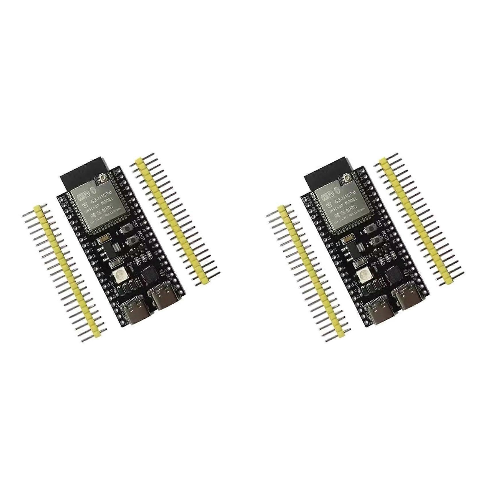 High performance dual core processor: Integrated with a 32-bit LX7 dual core processor, providing powerful computing power and low-power performance Wi Fi and BT dual-mode support: Supports 2.4GHz Wi Fi and BT 5 (BLE), compatible with multiple wireless communication protocols Efficient data transmission: With a data rate of up to 150 Mbps, it ensures a fast and stable connection Multi interface: Comes with two Type-C interfaces, one can be used directly with a COM tag, and the other USB can be powered on using OTG or by holding down BOOT to display the port and download the program normally Low power and high power modes: Equipped with a low-power coprocessor and a high power mode of up to 20 dBm, suitable for various application scenarios Working voltage: 3.3-5V IO ports: 36 IO ports Flash:N16R8 (16M),N8R2 (8M) PSRAM:N16R8 (8M),N8R2 (2M) 2 I2C, 4 SPI interfaces Size: 57mm x 28mm (The product appearance and printed words may vary depending on the batch, but this does not affect use) Color:As shown Material:PCB Package Contents: 2 x development board 4 x needle arrangement (unwelded needle arrangement)