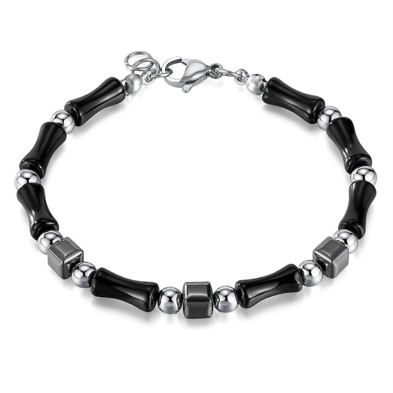 Simple Stainless Steel Ink Style Bamboo Patchwork Bracelet 1. Unique modeling, personalized and versatile 2. Exquisite workmanship, healthy and harmless material 3. Smooth grinding, comfortable to wear, does not hurt the skin 4. Not easy to lose color deformation, durable 5. Material: stainless steel, natural stone, black gallstone 6. Processing technology: polishing 7. Chain length: about 20cm 8. Weight: about 11g